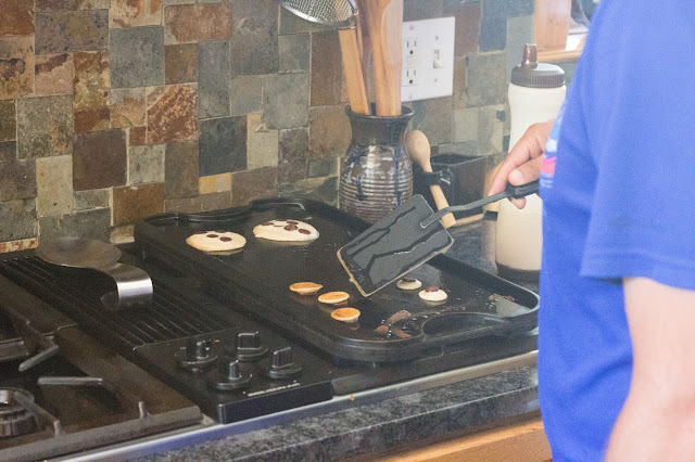 Use a ladle or measuring cup to spoon about 1/4 cup batter onto the griddle (or use a tablespoon to make super-mini pancakes like Mufasa). Scatter a few chocolate chips on top of the wet better. When the surface is dotted with tiny air bubbles, flip the pancakes and cook the other side until golden brown. Serve with butter, syrup, whipped cream, powdered sugar, berries, extra chocolate chips or my favorite - plain.