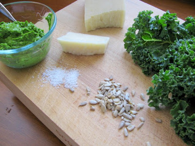 This week I decided to play on Bean and Roo's recent ardor for all things kale and created my own version of pesto. Given Roo's allergies, I opted for sunflower seeds instead of nuts and wasn't quite sure how they'd hold up against the kale, but the results were fabulous. I will be making this again and plan to experiment with other greens...spinach, chard, collards. Give it a try!